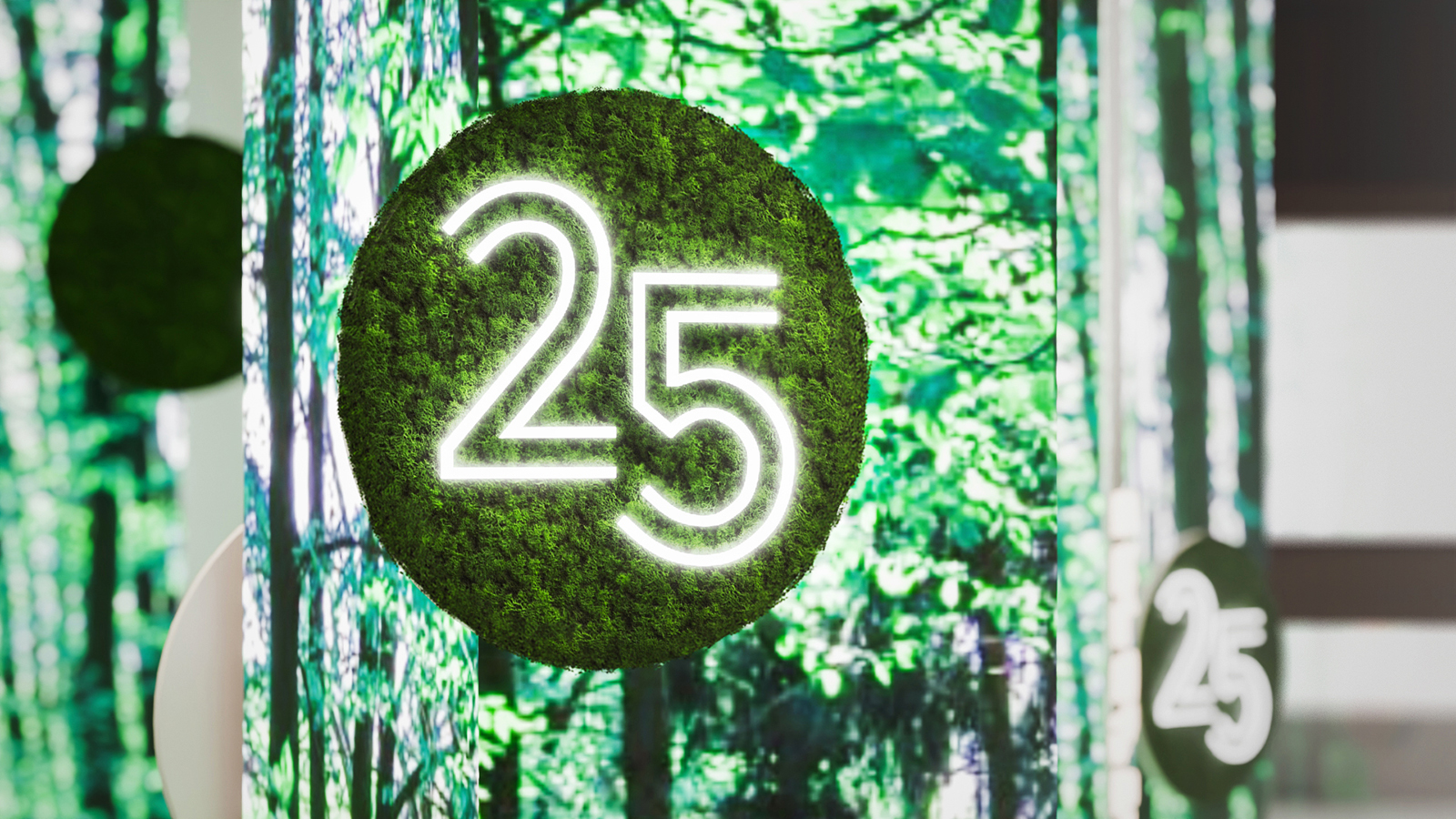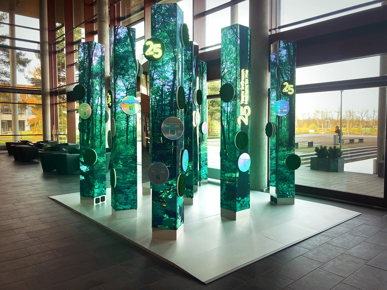 Il nostro studio, in collaborazione con l’agenzia Arte Vetrina Project, è stato incaricato di immaginare una installazione artistica che rappresentasse i valori della decarbonizzazione e digitalizzazione, veicolasse i videoracconti di 25 collaboratori selezionati tra tantissimi, e infine testimoniasse l’impegno concreto assunto dal gruppo Infineon nell’ambito della sostenibilità e riforestazione.